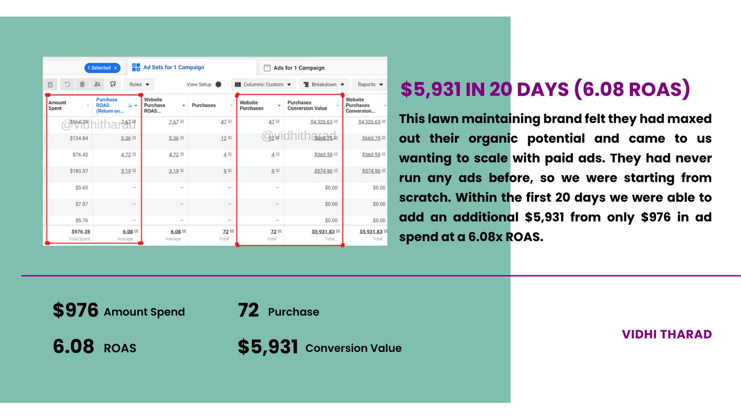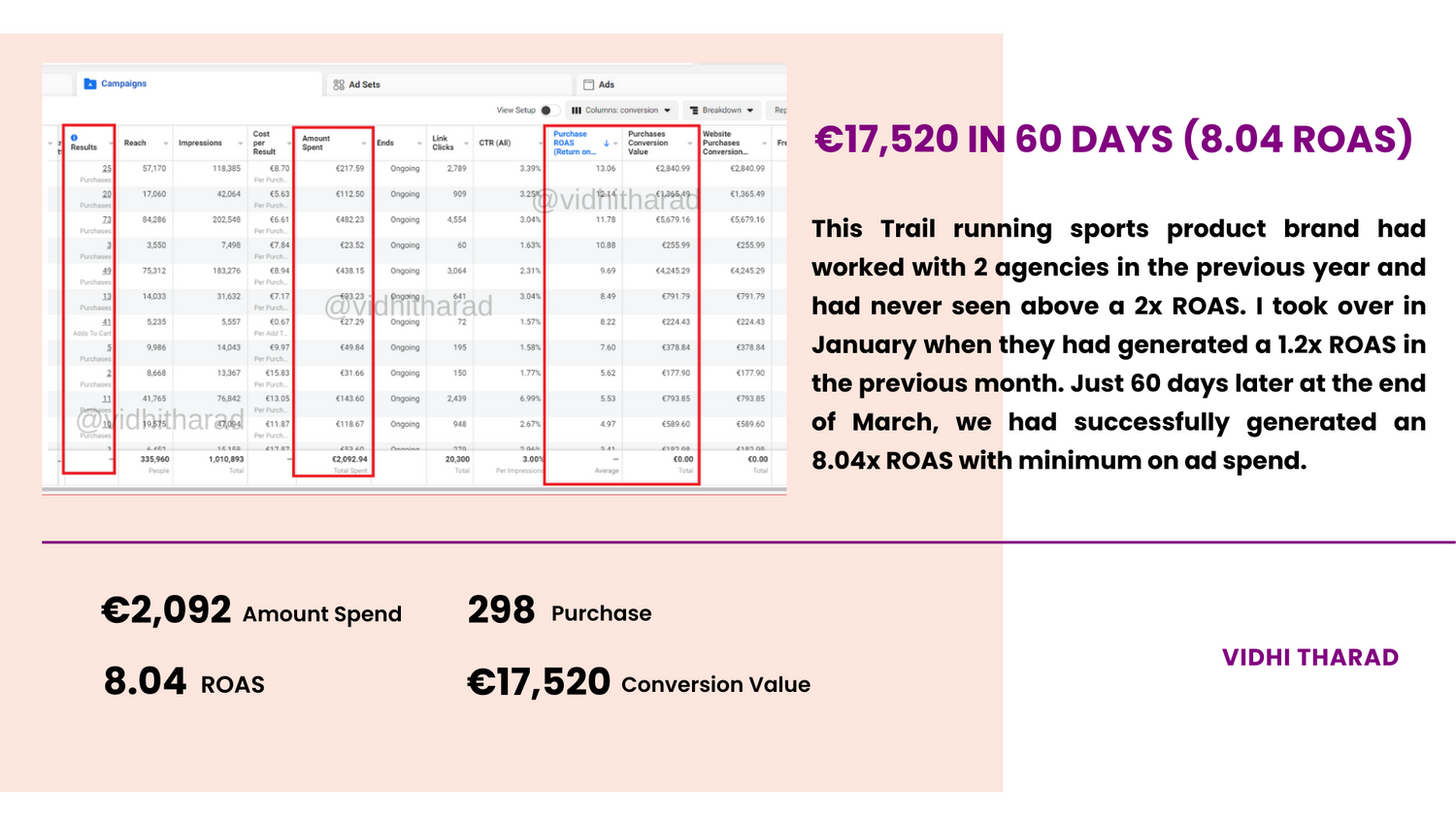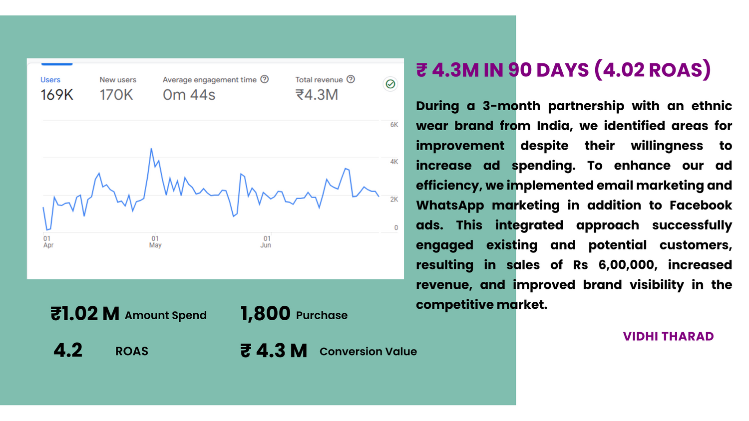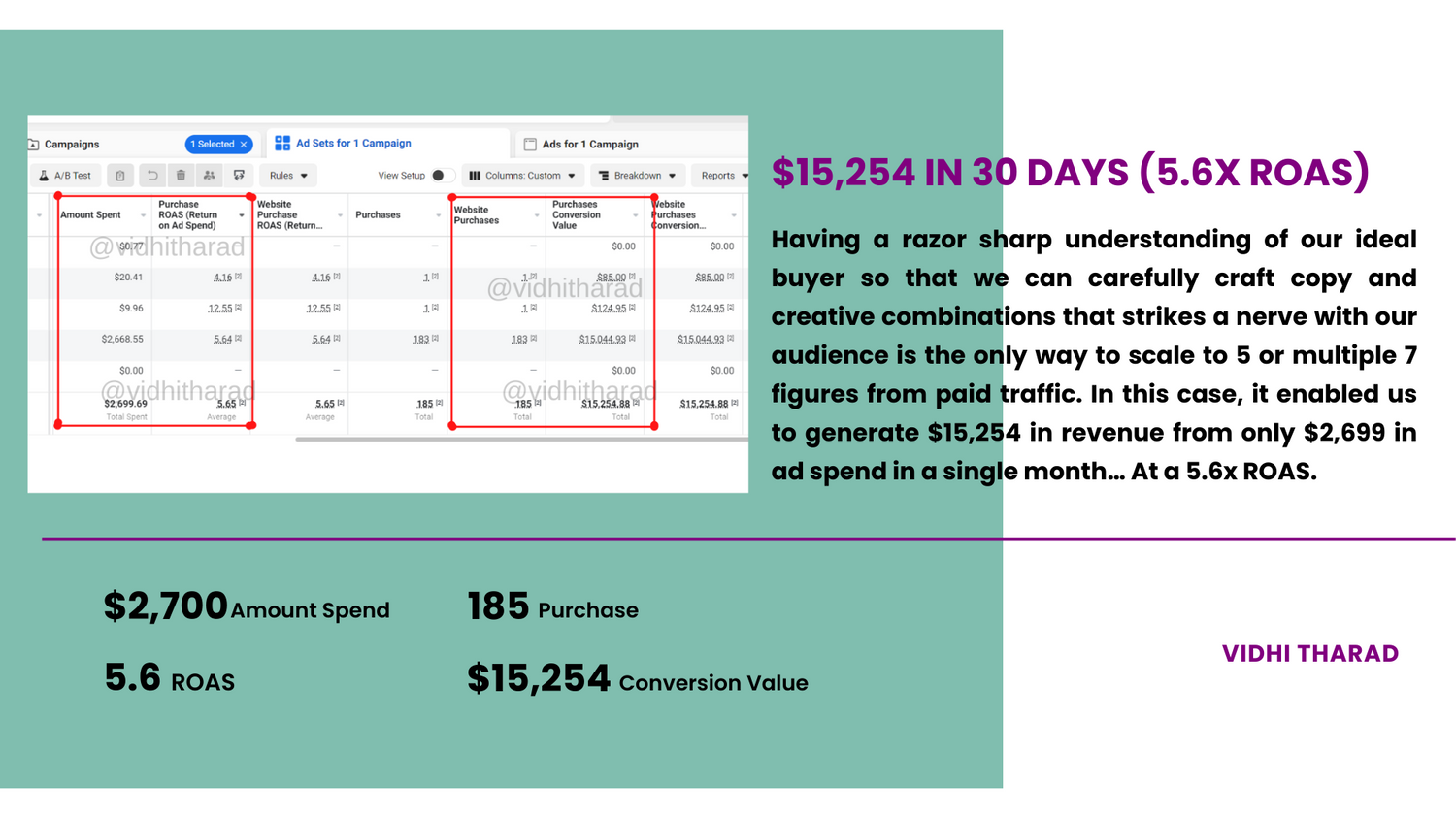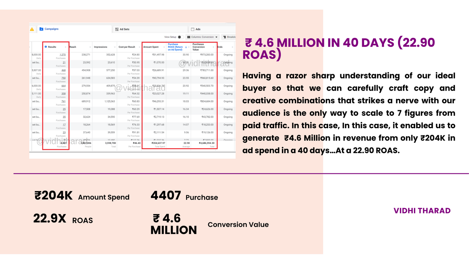Outsourcing my Meta ads to Vidhi was one of the best decisions I’ve made for my business. I grew my email list by over 400 leads in the spam of 30 days, and the best part is that I didn’t have to learn a new system, track complication test, or monitor any factors. Vidhi took care of everything for me so that I could focus on my own zone of business. I highly recommend hiring her so that you know your well- earned ad dollars are spend efficiently and not flushed down the toilet.